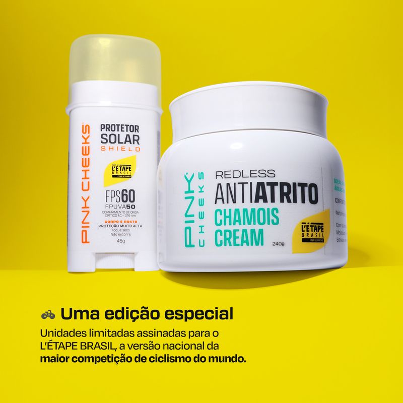 Já o PROTETOR SOLAR CORPORAL SHIELD, best-seller entre os amantes do ciclismo, mantém sua pele blindada contra o sol com muita proteção, conforto e praticidade — conta com FPS 60, FPUVA 50, zero sensação pegajosa e fácil aplicação em formato stick.