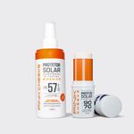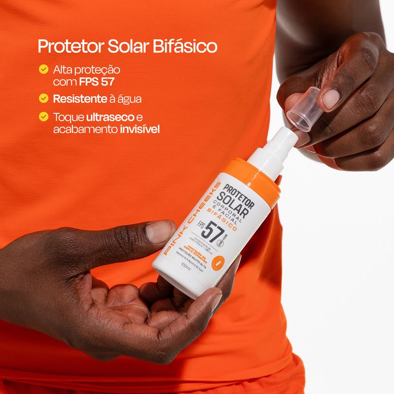 Complementando a proteção, o Protetor Solar Bifásico garante cobertura eficaz para rosto e corpo com FPS 57 e FPUVA 30, protegendo contra raios UVB, UVA e UVA longo. Com textura leve, toque seco e absorção imediata, proporciona conforto sem deixar resíduos. Sua embalagem em spray facilita a aplicação prática e uniforme, enquanto a fórmula resistente à água e ao suor é indicada para todos os tipos de pele, inclusive oleosas e acneicas.