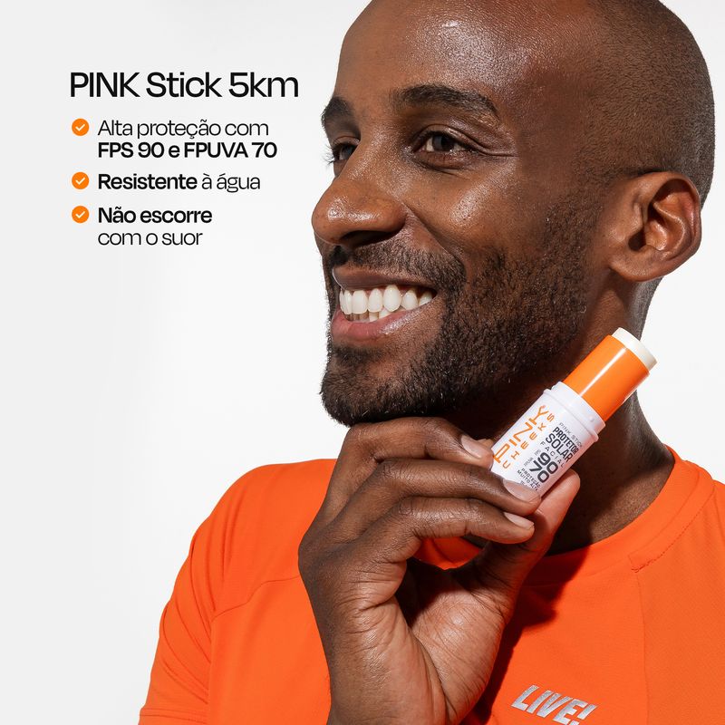 O PINK Stick 5KM oferece proteção solar de amplo espectro com cobertura incolor, adaptando-se a todos os tipos e tons de pele. Sua fórmula une filtros orgânicos e inorgânicos para bloquear os efeitos nocivos da radiação, além de contar com Vitamina E, que entrega ação antioxidante, auxilia na preservação do colágeno e protege contra os radicais livres. Ultra resistente, não escorre, não arde os olhos e permite reaplicação fácil a qualquer momento, mesmo durante a corrida.