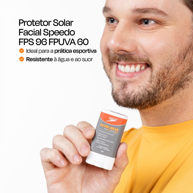Já o PROTETOR SOLAR FACIAL SPEEDO FPS 96 FPUVA 60 combina alta proteção e ultra resistência à água e ao suor com a praticidade do formato stick. Dentro ou fora d’água, a performance é a mesma: não derrete nem escorre nos olhos, do início ao fim do treino.